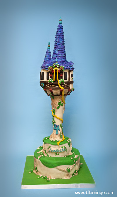 Little Miss Isabella had an extra special guest at her recent 4th birthday party, Princess Repunzel, herself! What a better way to celebrate this Tangled themed party than to have the tower in cake! The tower stood over 3 feet tall, and was accented with white chocolate details!