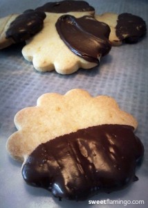 4. Dip cookies half way, into ganache and place on wax paper, till the chocolate cools.